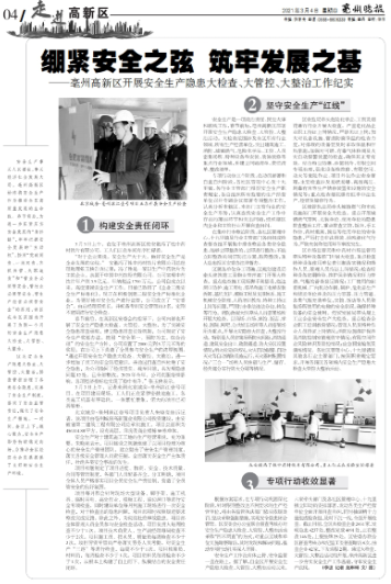 年后復(fù)工不久,亳州市高新區(qū)即對(duì)轄區(qū)內(nèi)的施工單位進(jìn)行逐個(gè)復(fù)工復(fù)產(chǎn)以及安全生產(chǎn)隱患大檢查、大管控、大整治。3月3日上午,亳州市高新區(qū)建管主任、第五管理中心主任、環(huán)保中心主任等領(lǐng)導(dǎo)以及亳州市記者來(lái)到亳州濱江壹號(hào)項(xiàng)目進(jìn)行實(shí)地現(xiàn)場(chǎng)檢查,并采訪了項(xiàng)目經(jīng)理朱曉亮。在聽取項(xiàng)目匯報(bào)、查閱安全管控資料后,當(dāng)?shù)馗髦鞴懿块T領(lǐng)導(dǎo)充分肯定了項(xiàng)目在現(xiàn)場(chǎng)安全、環(huán)保管控等方面的有力舉措,并在亳州晚報(bào)上刊登了項(xiàng)目全方位的安全管理體系。